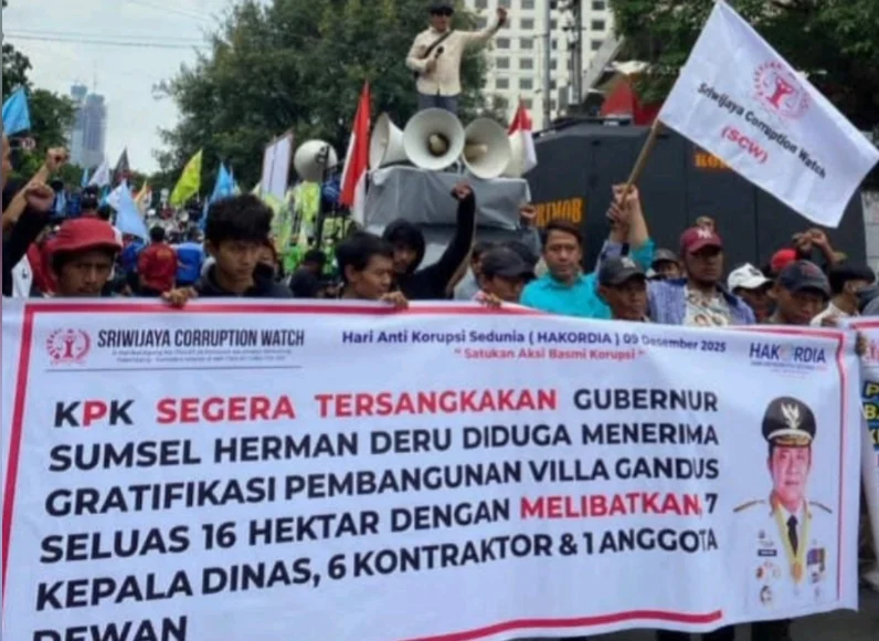Palembang, Tipikorinvestigasi.id – Momentum Hari Anti-Korupsi Sedunia yang jatuh pada 9 Desember 2025 dimanfaatkan oleh para aktivis anti-korupsi di Sumatera Selatan untuk menyuarakan keprihatinan mereka terkait dugaan tindak pidana korupsi yang diduga melibatkan Gubernur Sumatera Selatan, Herman Deru. Dalam aksi yang digelar di depan kantor KPK, para pengunjuk rasa mendesak agar komisi anti rasuah tersebut segera menindaklanjuti sejumlah laporan yang telah mereka ajukan.