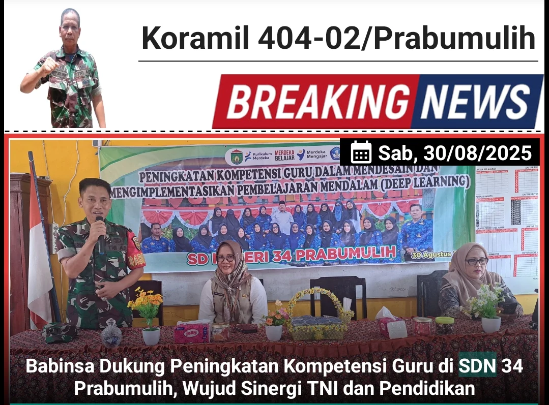 Kodam II Sriwijaya, Prabumulih – Majasari -, Bintara Pembina Desa (Babinsa) Kelurahan Majasari, Pelda Darmadi, anggota Koramil 404-02/Prabumulih Kodim 0404/Muara Enim, turut hadir dalam undangan dari SDN 34 Prabumulih terkait Peningkatan Kompetensi Guru Dalam Mendesain Dan Mengimplementasikan Pembelajaran Mendalam (Deep Learning) Kegiatan ini diselenggarakan di Kelurahan Majasari, Kecamatan Prabumulih Selatan, Kota Prabumulih, pada Sabtu (30/08/2025).