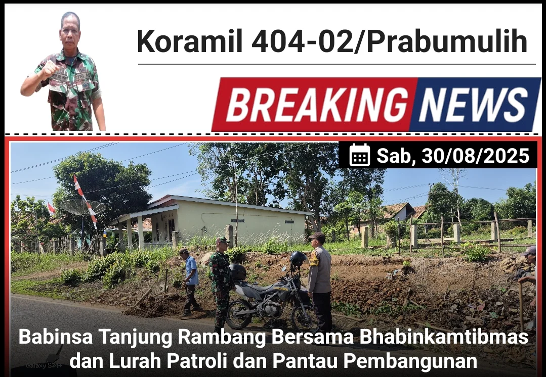 Kodam II Sriwijaya, Prabumulih – Tanjung Rambang -, Koptu Hasan Basri, Babinsa Kelurahan Tanjung Rambang dari Koramil 404-02 Prabumulih Kodim 0404/Muara Enim, bersama Bhabinkamtibmas setempat dan Lurah Tanjung Rambang melaksanakan patroli rutin dan pengecekan langsung terhadap kegiatan pembangunan serta aktivitas warga di wilayah Kelurahan Tanjung Rambang Kecamatan Rambang Kapak Tengah (RKT) Kota Prabumulih Pada Sabtu (30/08/2025).