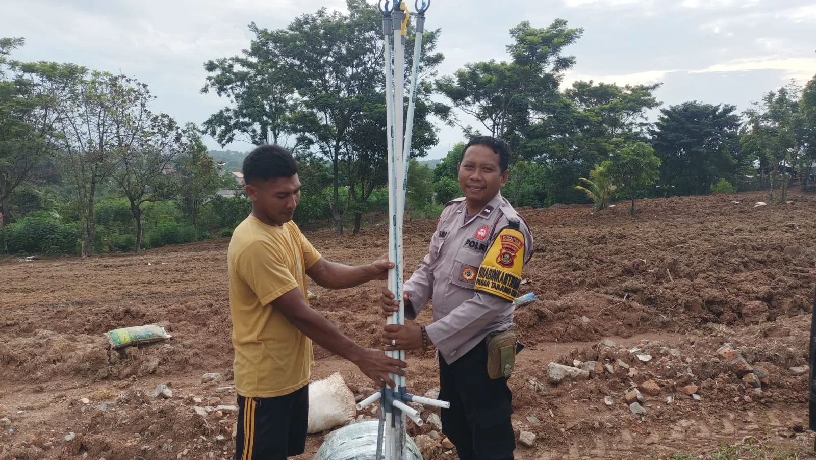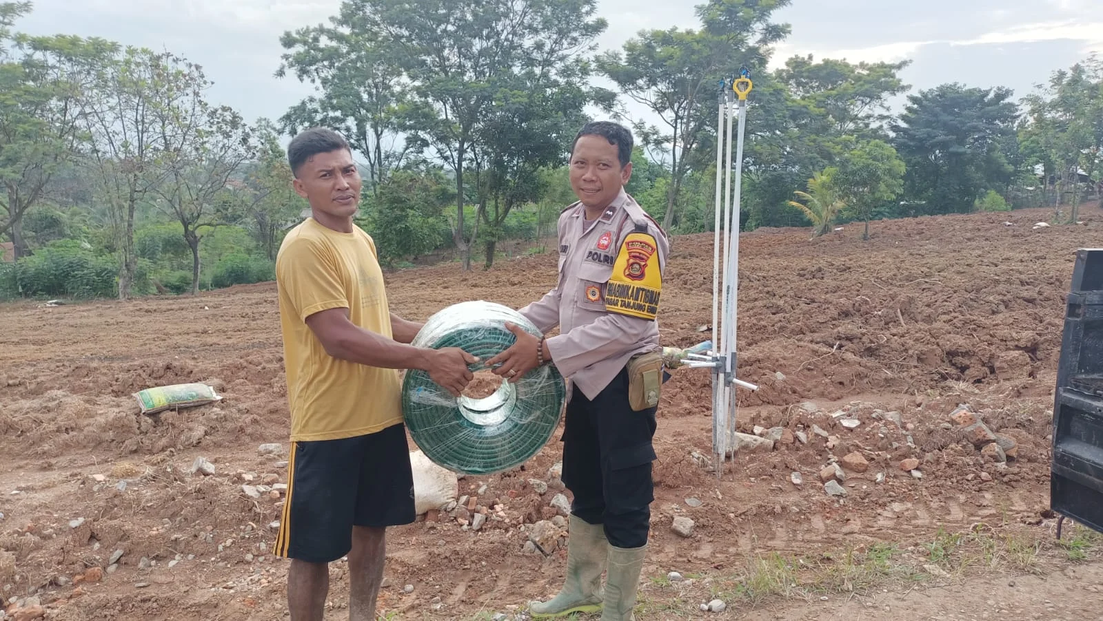 Kegiatan yang diikuti oleh Aipda Amriyanto, Aipda Rendy Simanjuntak, dan Briptu Randy. Tak hanya membantu pengerjaan lahan, mereka juga menyerahkan bantuan selang air sepanjang 200 meter lengkap dengan alat kincir air untuk mendukung penyiraman tanaman jagung para petani.
