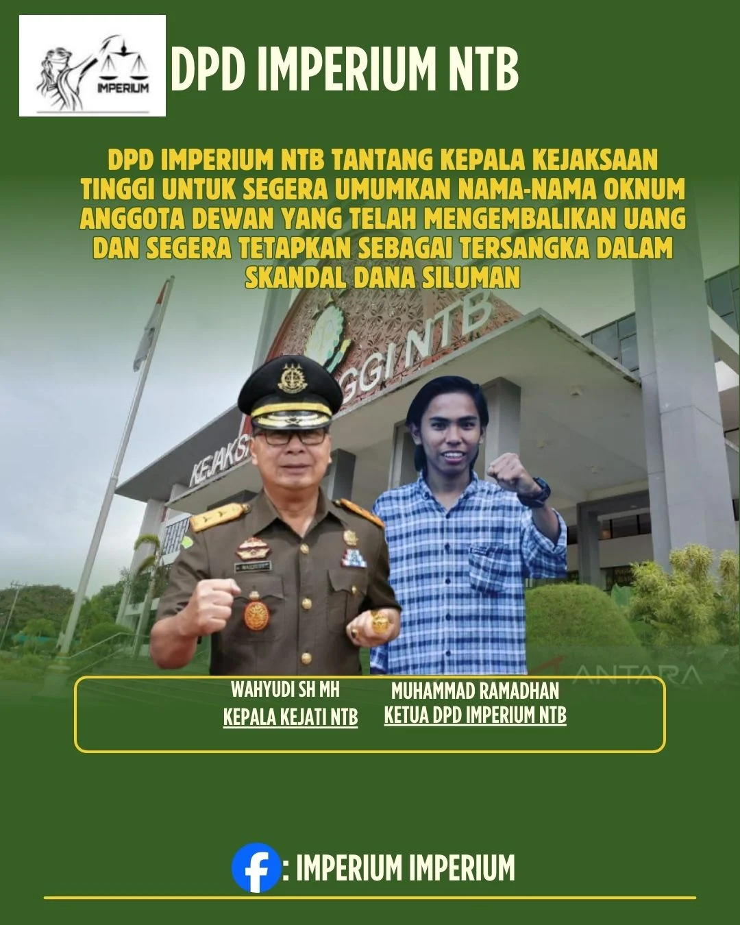 Mataram — 08 Desember 2025 DPD IMPERIUM NTB melalui Ketua Muhammad Ramadhan menyampaikan pernyataan resmi yang menantang Kepala Kejaksaan Tinggi NTB untuk membuka secara terang benderang nama-nama oknum anggota dewan yang telah mengembalikan uang dalam dugaan skandal dana siluman.