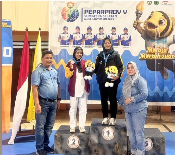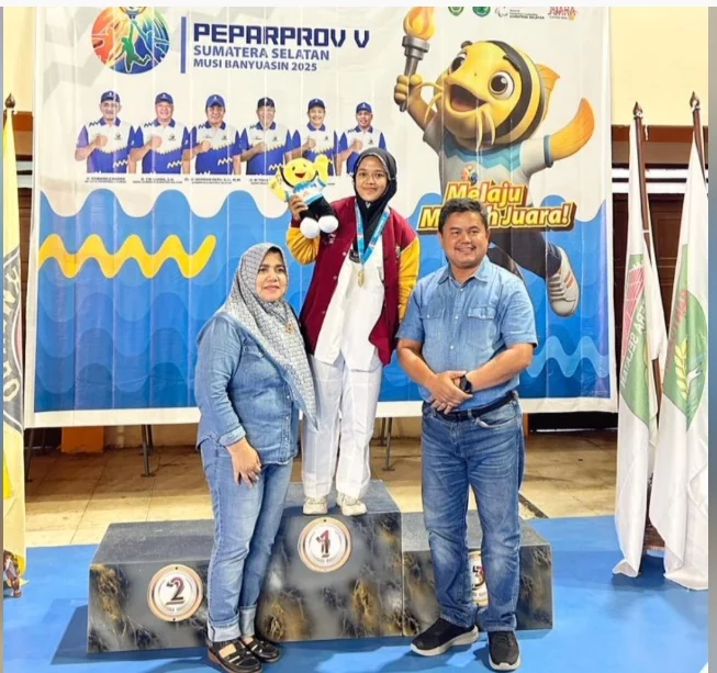 Pengalungan medali emas kepada Eka Putri Yuniasari dilakukan langsung oleh Kadispora Kabupaten Muara Enim, sebagai simbol penghargaan atas perjuangan dan dedikasi yang telah diberikan.