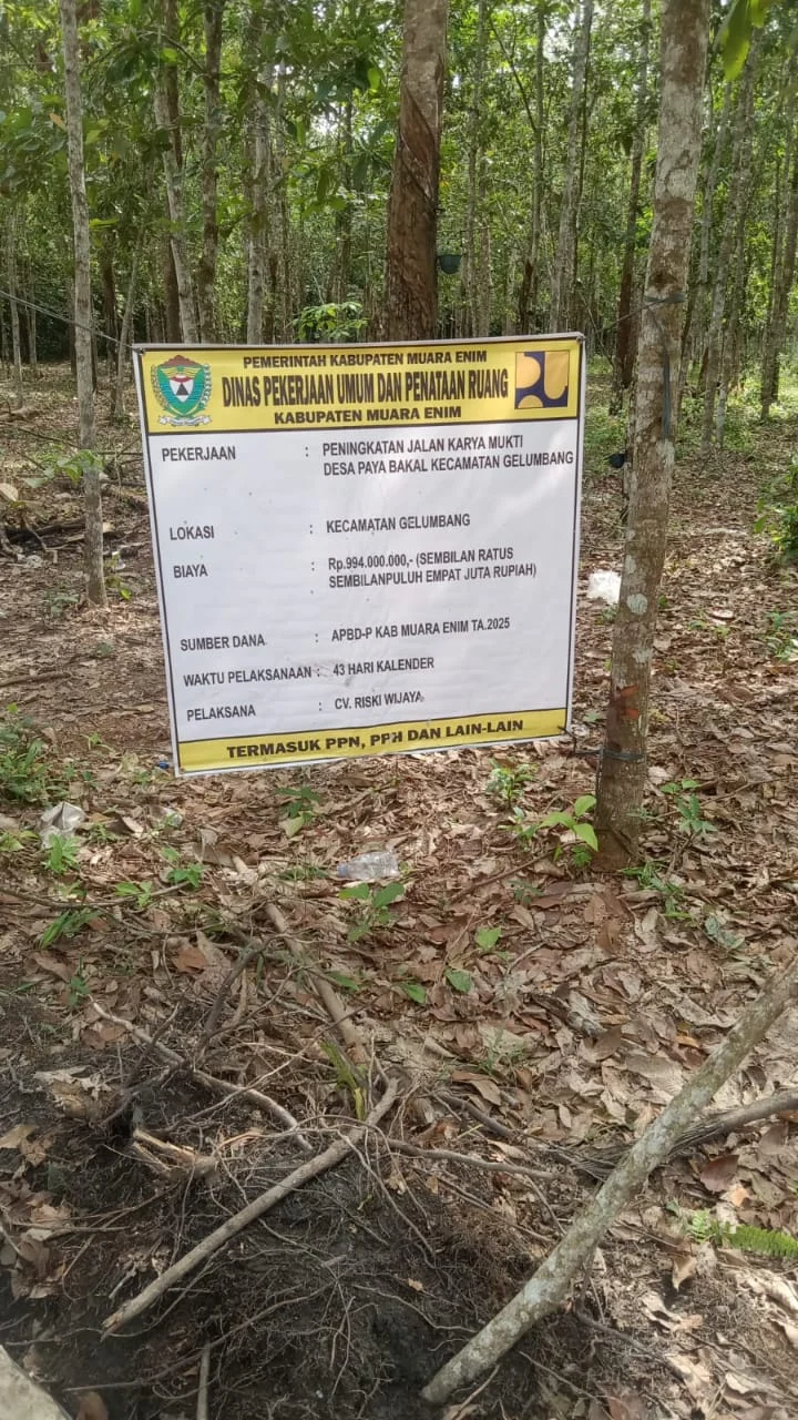 ‎Pekerjaan yang dimaksud meliputi Pembangunan Jalan Setapak Desa Paya Bakal dengan nilai anggaran sebesar Rp492.593.000 serta Peningkatan Jalan Karya Mukti Desa Paya Bakal dengan nilai anggaran Rp994.000.000. Kedua kegiatan tersebut bersumber dari APBD-P Kabupaten Muara Enim Tahun Anggaran 2025 dan dilaksanakan oleh CV. Riski Wijaya sebagai kontraktor pelaksana.