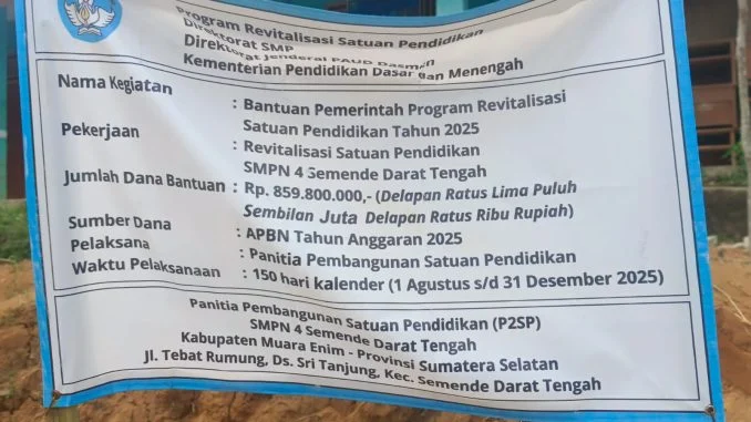 MUARA ENIM, Tipikorinvestigasi.id – Proyek Revitalisasi Satuan Pendidikan SMPN 4 Semende Darat Tengah dengan nilai anggaran APBN 2025 mencapai Rp 859.800.000,- yang sebelumnya pernah diberitakan karena diduga dikerjakan asal-asalan dan sarat korupsi, kini seakan hilang di telan bumi tanpa adanya tindakan tegas dari pihak terkait. Kondisi ini menuai kritik keras dari masyarakat yang menuntut keadilan dan transparansi.