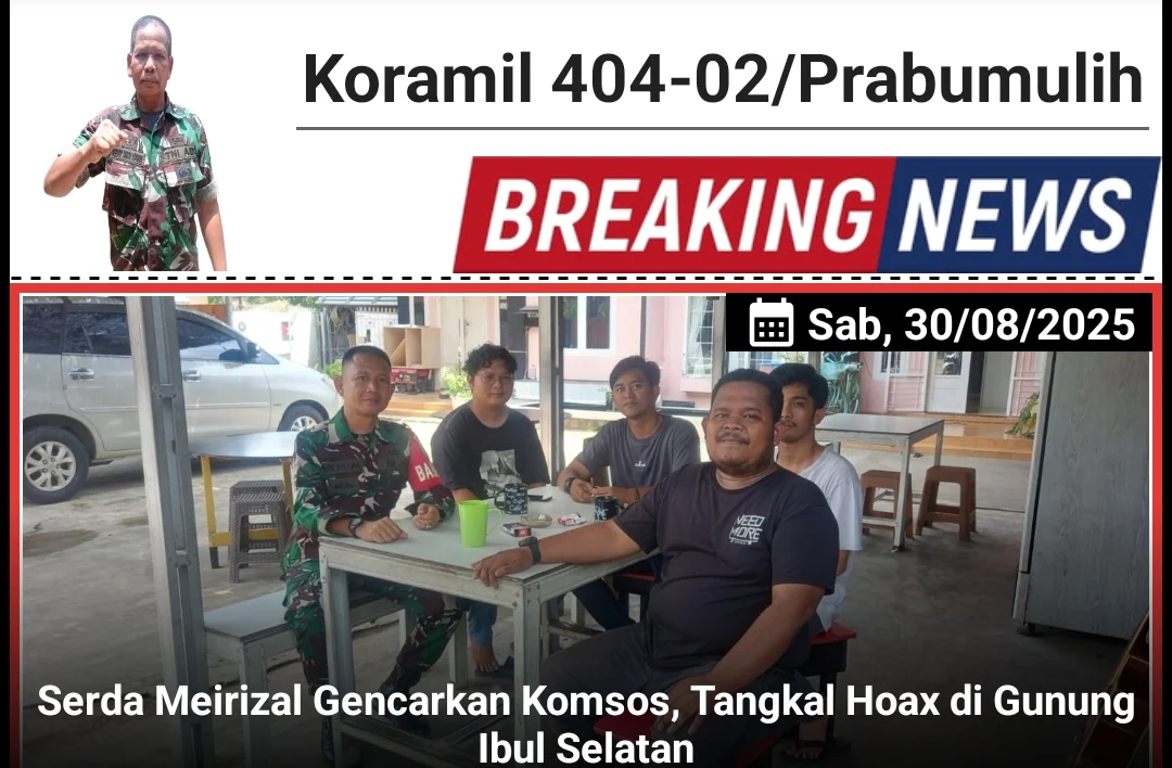 Kodam II Sriwijaya, Prabumulih – Babinsa Kelurahan Gunung Ibul Selatan, Serda Meirizal dari Koramil 404-02/Prabumulih Kodim 0404/Muara Enim, aktif melaksanakan Komunikasi Sosial (Komsos) dengan warga di wilayah binaannya, Kelurahan Gunung Ibul Selatan, Kecamatan Prabumulih Timur, Kota Prabumulih pada Sabtu (30/08/2025).