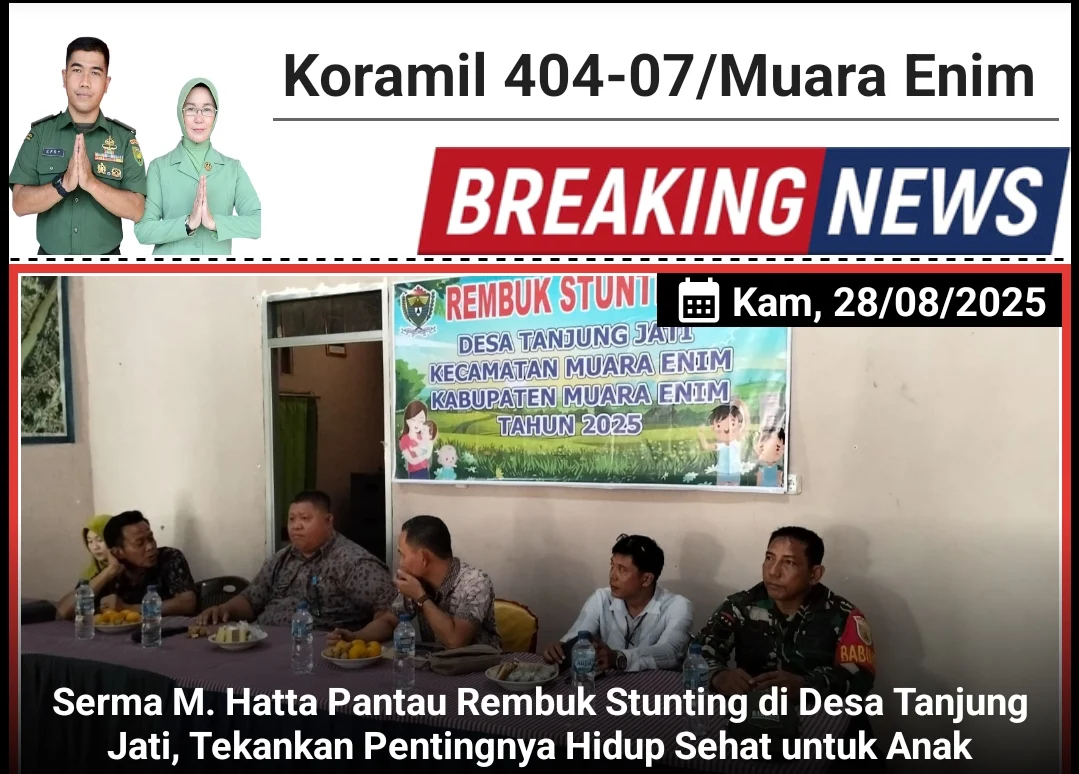 Kodam II Sriwijaya, Muara Enim – Tanjung Jati -, Serma M. Hatta dari Koramil 404-07/Muara Enim Kodim 0404/Muara Enim, melaksanakan monitoring kegiatan Rembuk Stunting di Desa Tanjung Jati Kecamatan Muara Enim Kabupaten Muara Enim pada Kamis (28 Agustus 2025), mulai pukul 13.30 WIB hingga selesai.